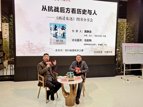 分享會以現場訪談的形式展開。分享嘉賓是《西遷東還》圖書作者龔靜染,訪談嘉賓是成都市廣播電視臺經濟頻道文創(chuàng)中心主任、成都市朗誦藝術家協(xié)會副主席、資深主持人任韻陶。兩位嘉賓采用“三種語言”(樂山話、四川話、普通話)為現場觀眾講述了書里書外眾多有趣的故事。龔靜染談到,自己因“發(fā)現”歷史而重新認識自己的故鄉(xiāng)樂山,重新認識抗戰(zhàn)時期西遷到大后方的一大批知識分子和民族精英。而任韻陶用人與歷史某種程度的“不相關性”,與作者一道帶領大家回望歷史,感受那段紛飛歲月中,一個個平凡故事,一段段歷史與人物的鮮活的勾連。