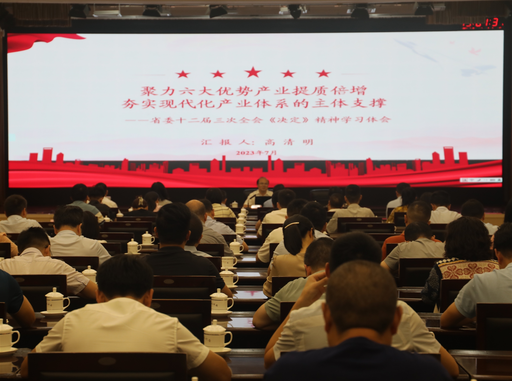 為深入學(xué)習(xí)貫徹習(xí)近平新時代中國特色社會主義思想,教育引導(dǎo)全廳黨員干部深入領(lǐng)會省委十二屆三次全會重大決策部署,激發(fā)大家干事創(chuàng)業(yè)、堅定推動高質(zhì)量發(fā)展的精氣神,7月20日,省政府辦公廳舉辦“督院大講堂”,圍繞“聚力六大優(yōu)勢產(chǎn)業(yè)提質(zhì)倍增 夯實現(xiàn)代化產(chǎn)業(yè)體系的主體支撐”,邀請省直機關(guān)宣講輔導(dǎo)團成員、省經(jīng)信廳綜合處高清明同志開展專題輔導(dǎo)。