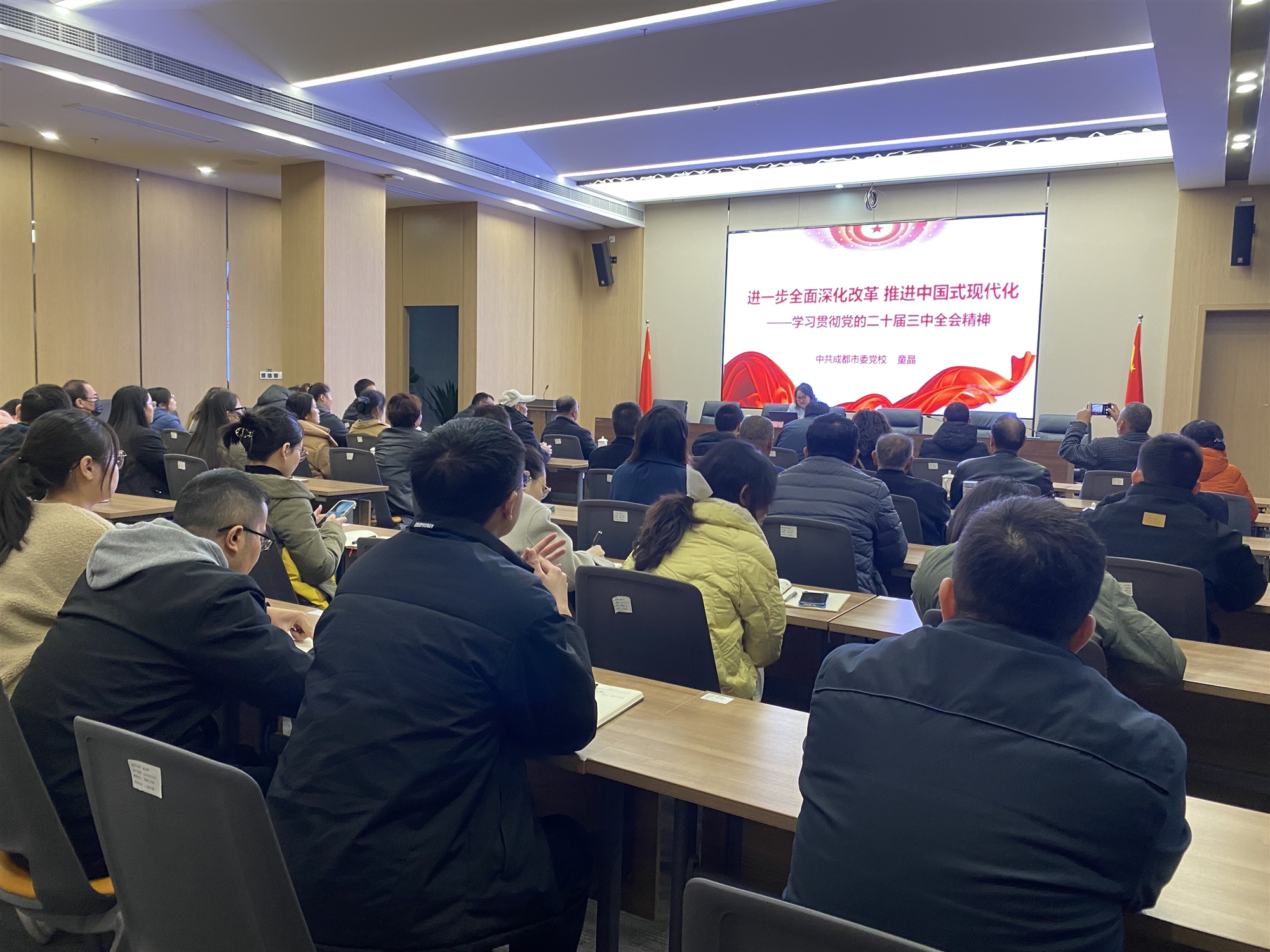 在隨后開展的黨的二十屆三中全會精神宣講會上,來自成都市委黨校的童晶副教授圍繞學(xué)習(xí)貫徹習(xí)近平總書記在黨的二十屆三中全會上的重要講話和全會《決定》,介紹了全會的基本情況、反映評價和籌備過程,并從深刻把握黨的二十屆三中全會的重大意義、深刻把握黨的二十屆二中全會以來黨和國家事業(yè)取得的重大成就、深刻把握進(jìn)一步全面深化改革的總體要求、深刻把握進(jìn)一步全面深化改革的重大舉措、深刻把握抓好全會精神貫徹落實的基本要求等方面,對黨的二十屆三中全會精神進(jìn)行了深入闡釋。