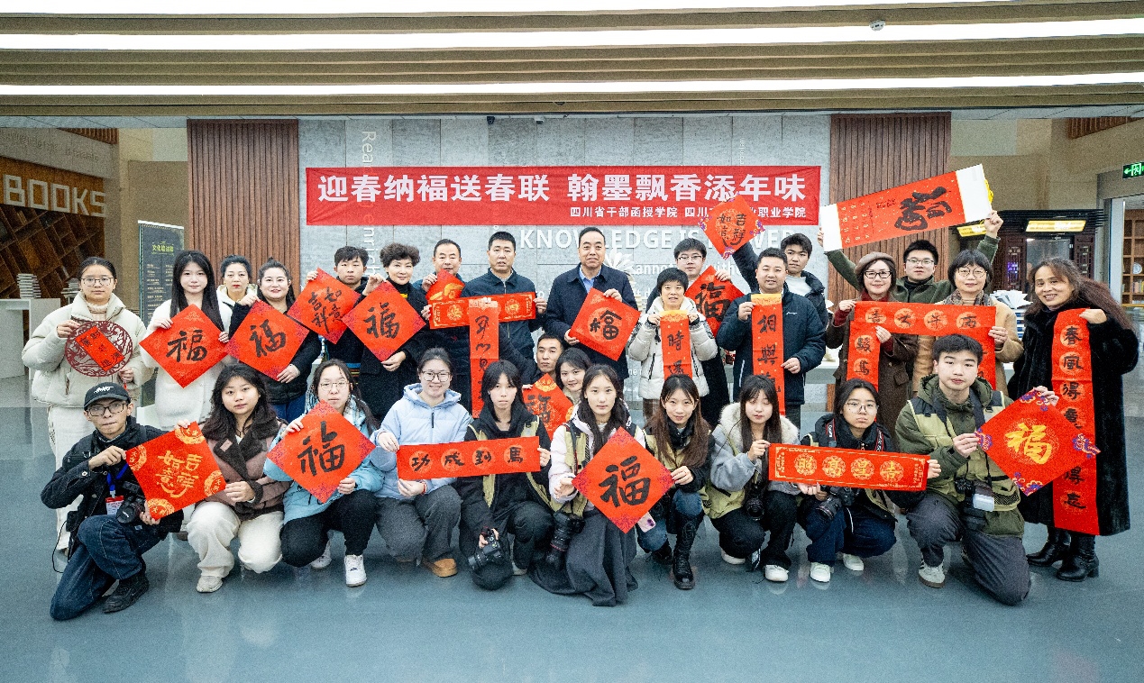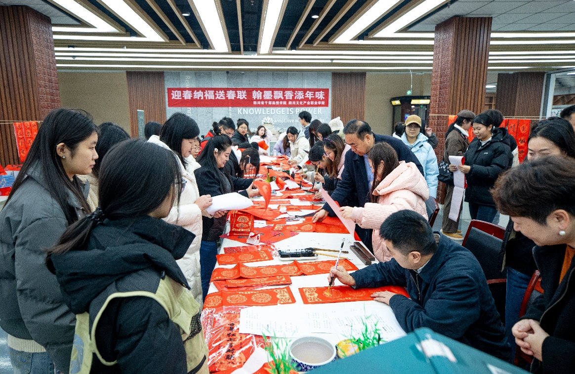 馬蹄聲近,年味漸濃。12月31日,四川省干部函授學(xué)院、四川文化產(chǎn)業(yè)職業(yè)學(xué)院黨委宣傳部牽頭,聯(lián)合校工會(退休工作處)、圖書(檔案)館等多部門,在圖書館大廳舉辦第九屆“迎春納福送春聯(lián)·翰墨飄香添年味”主題活動?;顒犹匮拭C省書法家協(xié)會賈入懿、裴少峰等多名書法名家現(xiàn)場揮毫,為師生及退休教職工送上馬年新春的美好祝福。