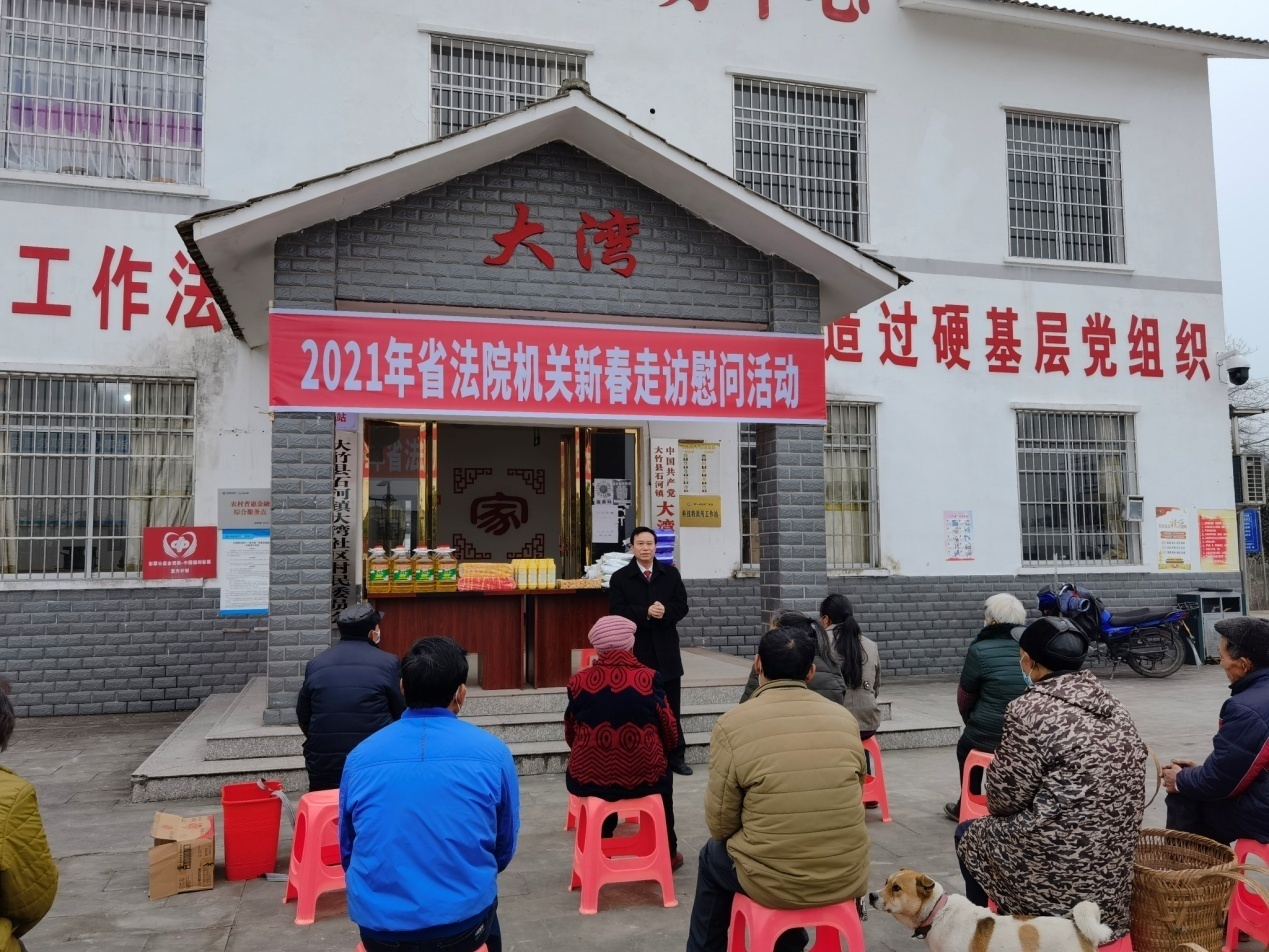 因疫情原因,1月18日下午,省法院走訪慰問組一行到大竹縣鐵佛村,對鐵佛村建檔立卡脫貧戶代表進行集中慰問并發(fā)放慰問物資。曾凡平代表省法院黨組送上新春祝福,并宣講黨的十九屆五中全會和省委十一屆八次全會精神,希望廣大群眾積極配合抗疫,不集聚不擺宴,不要主動要求在外打工子女回家過年。